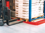 Narrow-aisle pallet racks with 50mm U-shape guiderail. Pallets can be positioned behind the guiderail without any special equipment.